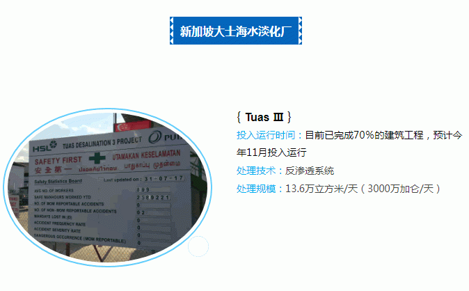 自2005年以來,新加坡已經在大士(Tuas)啟用兩座海水淡化廠。新加坡的Tuas海水淡化工廠由Hgflua地方水處理公司設計和建造,該海水淡化工廠使用了“返滲透膜”技術,可通過迫使海水穿過帶有微孔的薄膜而將海水中的鹽分濾除,能夠達到新加坡目前用水需求量的25%。